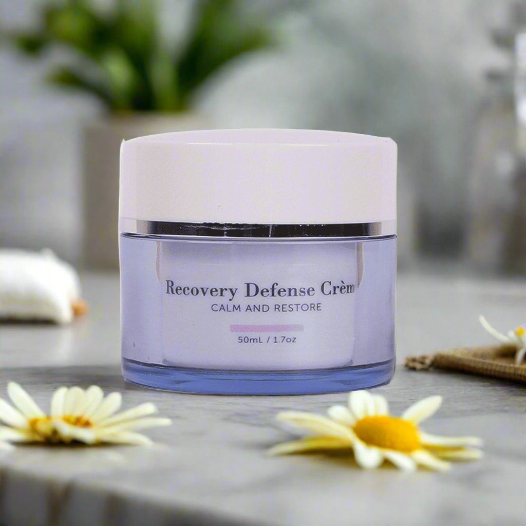 Chronic low-grade micro-inflammation can cause visible consequences on the skin such as deterioration of DNA proteins. Inflammation affects normal skin barrier function and can result in accelerated aging. Recovery Defense Creme contains several active components that target chronic itchy, red or problematic skin resulting from allergic responses, environmental sensitivity or abrasion as a result of a more aggressive professional treatment. The significant anti-oxidative and anti-inflammatory benefits help to protect and maintain epidermal stem cell capacity, therefore, is recommended for professional prescriptive homecare.